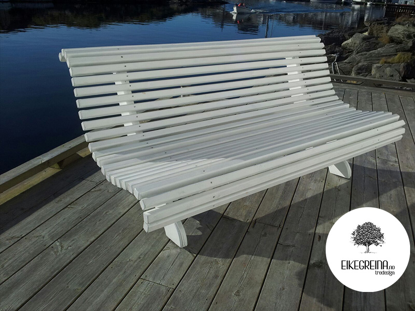 Bryggebenk i hvitmalt impregnert furu. Kan også brukes andre plasser enn på bryggen. God sittekomfort og rommer mange gode venner.
